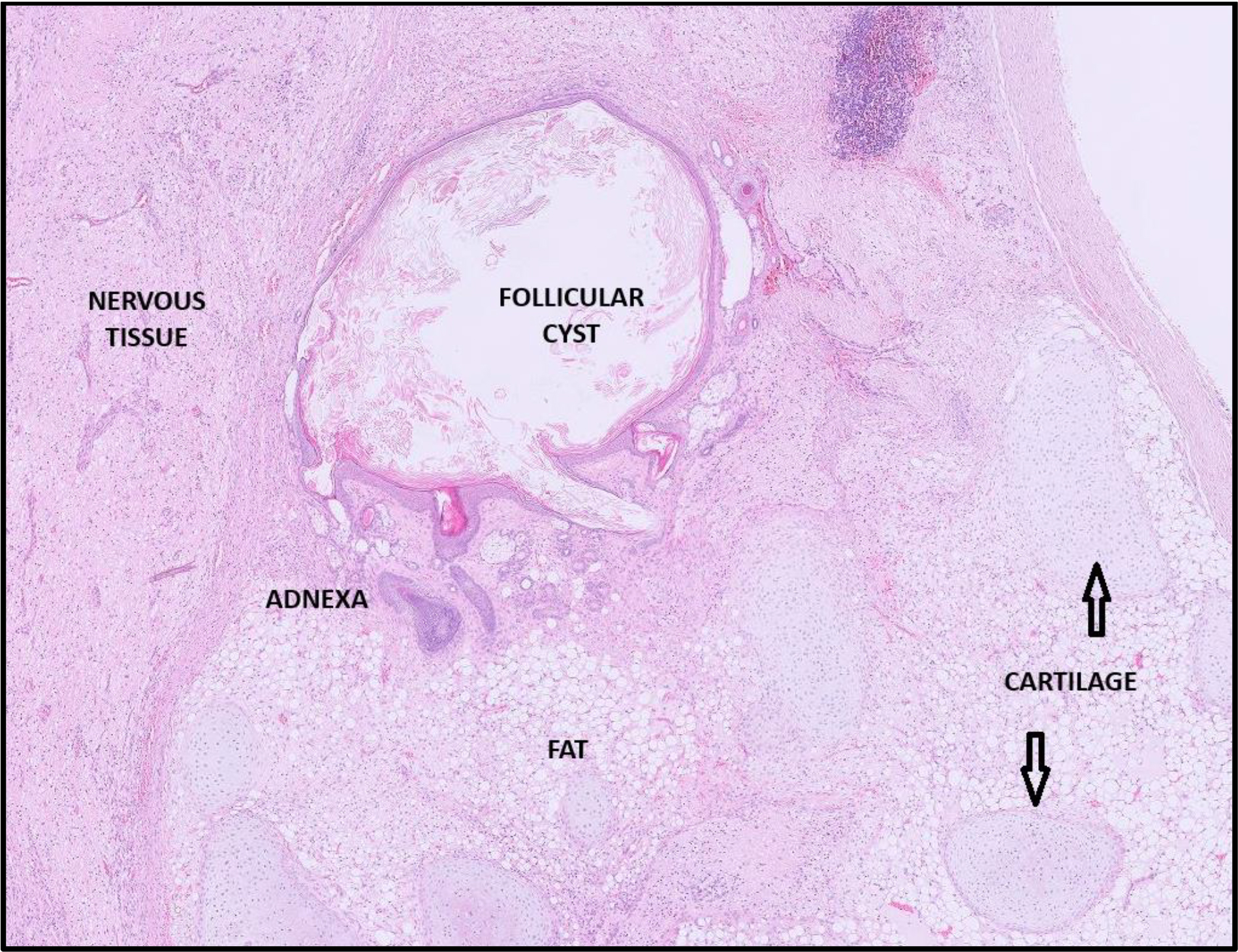 This is the strangest of tumours so has to be included in a segment on ovarian neoplasia! Teratomas are defined as neoplasms composed of cells derived from at least two, often three, embryonic germinal layers (ectoderm, mesoderm and endoderm). They are presumed to arise from the pluripotent germ cells that undergo differentiation. They are very uncommon but most commonly described in female dogs. The images in the cases below contain a keratinised cyst, lobules of fat, respiratory epithelium, hair shafts, neuropil with neurons, fat and cartilage. We can sometimes see bone or rudimentary teeth.