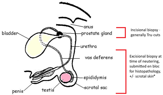 The male reproductive tract comprises two testes, each with epididymis, spermatic cord and ductus (vas) deferens; penis; prepuce; and prostate gland, the only accessory sex gland in the dog. Histopathological evaluation of the male reproductive tract may be required for the following reasons: